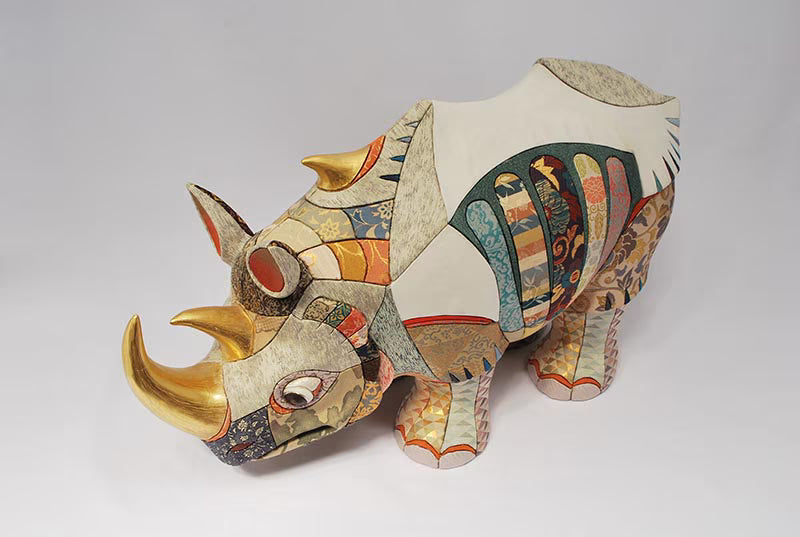 This rhinoceros, a large piece in the anima series, is handcrafted from tosso (paulownia wood powder and glue) and gofun (oyster shell pigment) — the same natural materials used in traditional Japanese crafts.